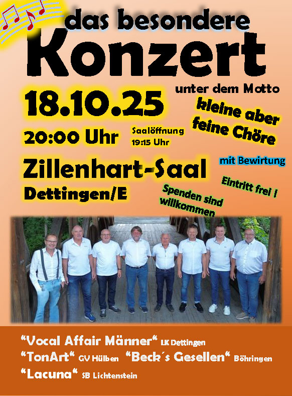Im Vorprogramm präsentiert der Chor Vocal Affair (Liederkranz Dettingen/Erms) mit einem 20-minütigen Programm einige Lieder aus seinem Repertoire.